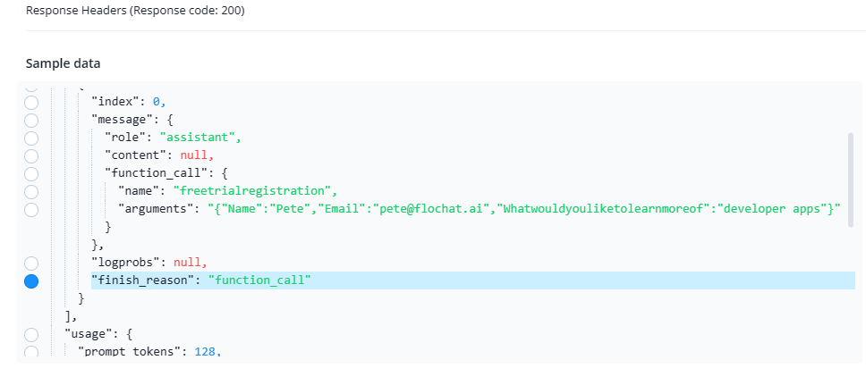 Perfect! We can see that the finish reason is now function\_call - This means that all data has been captured and the flow will be sent.