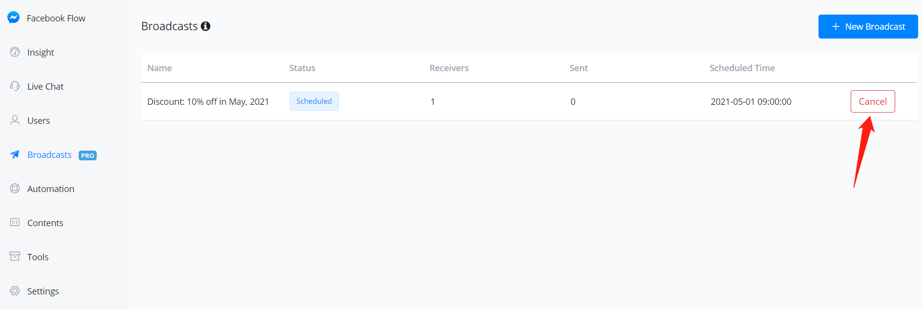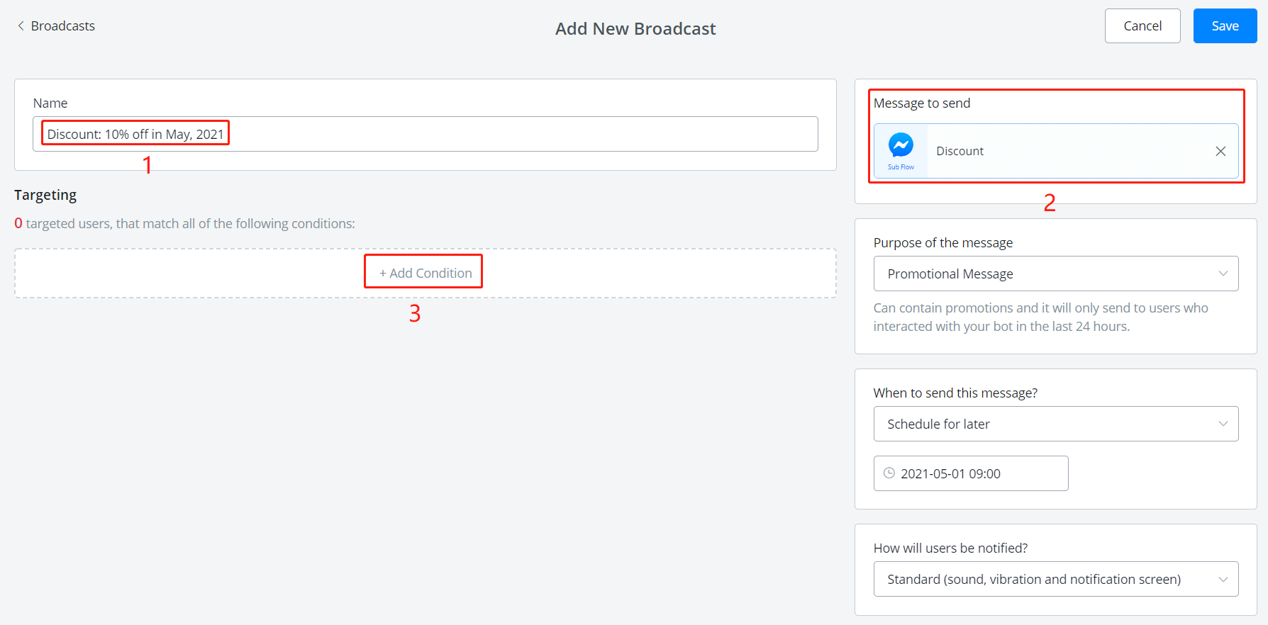 If you choose "Now" for the schedule, the message will be sent once you click "Save". If not, you can cancel the broadcast anytime before it sent.