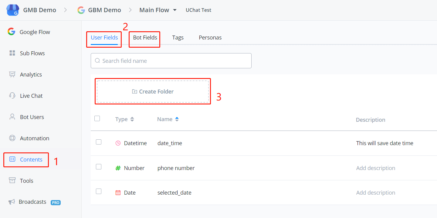 Click the blue "+ New User/Bot Field" button on the right side to create a field. "Field Name" is a must. You can use any character to separate words like underline or space. We suggest you keep the field name as concise as possible, to avoid any possible display issue.