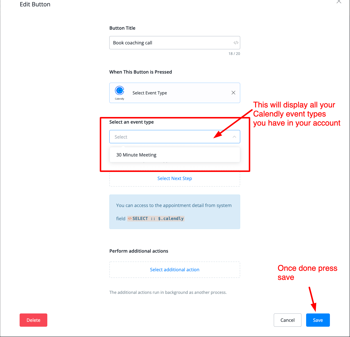 Once done you will be able to select an event type. These events are being fetched from your Calendly account.
