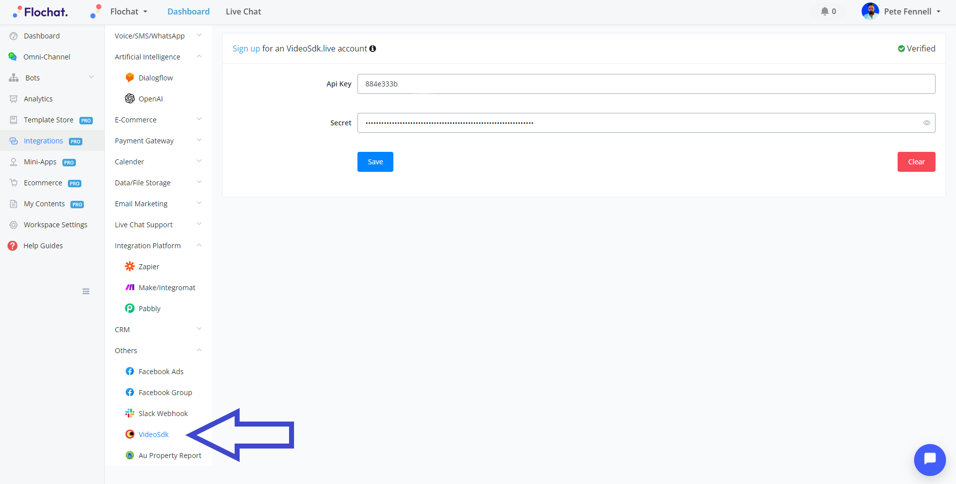 To connect to your VideoSdk account go to **Integrations** from the left-hand menu in your main dashboard overview. Then select **VideoSdk** in the list.